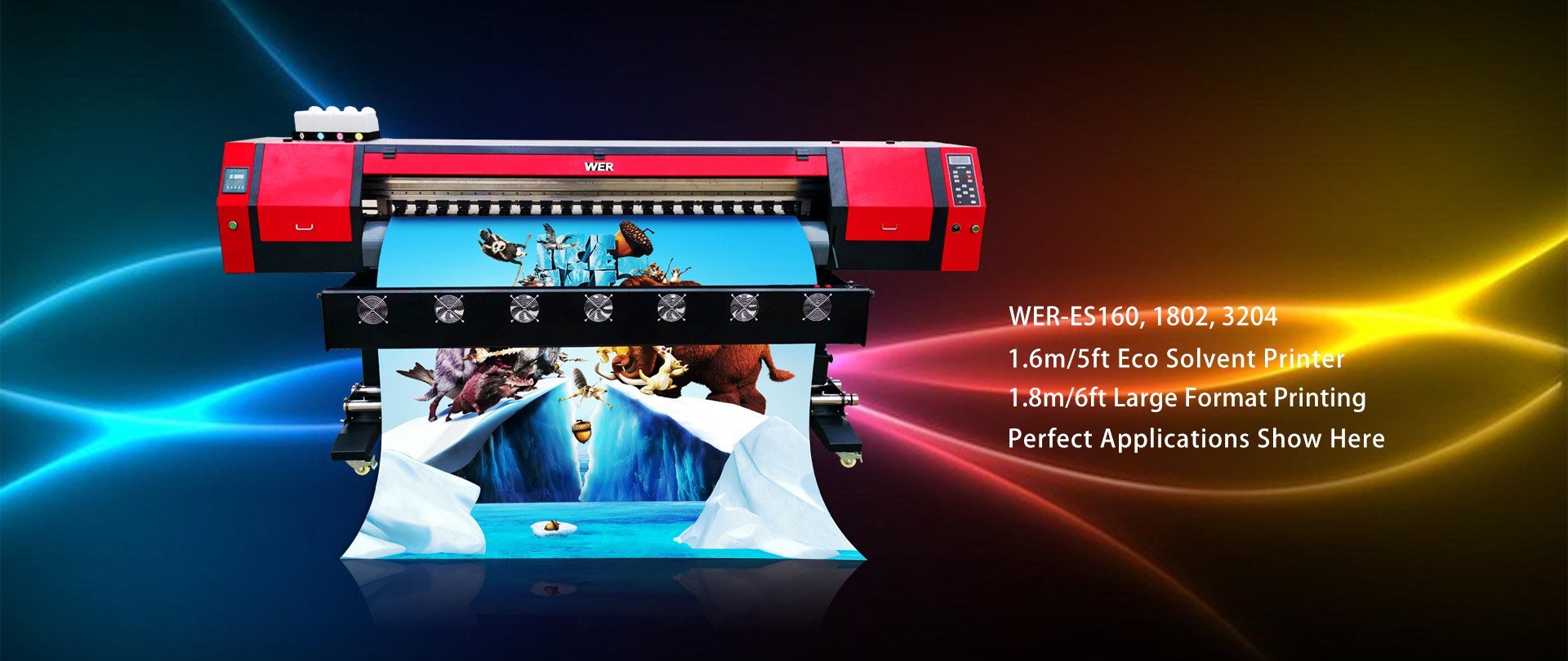 Еко растворувач принтери е главно за печатење затворен и надворешен рекламен материјал како флекс транспаренти, баннер крпа, винил, налепници, позадинско осветлување, матна винил, платно ...